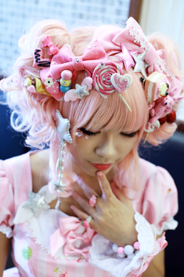 Sweet lolita often uses motifs like fruit, candy, animals, toys, stars and other cute things. It often features fuller, longer hairstyles than classic or gothic, and many Sweet Lolita wear wigs to achieve fuller, curly styles. The accessories often include over-sized plastic rings, necklaces and bangles in pastel or bright colors with cute motifs. Glitter, matte and glossy finishes and bright or pastel colors are common.