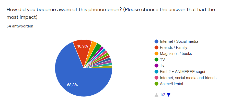 Additionally, we noted that from the respondents that answered having an (vague) idea of what Lolita is the vast majority replied becoming aware of Lolita through internet and/or social media. As Lolita fashion has been appearing in media such as anime, manga and YouTube, the spreading of such media in the West indirectly caused Lolita to become more noticeable to people in the West as well through online sources. The answer of internet and social media being the dominant choice here was also within our expectations.
