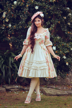 When wearing a Classic lolita look, there are quite often solid color pieces, florals, stripes, and prints featuring motifs like crowns, crests, antiques, animals, architecture, and reproductions of old master paintings. Animals and fruit prints in classic Lolita tend to have a realistic or antique look to them, as opposed to the more cartoon or fantasy like styles favored by sweet Lolita.