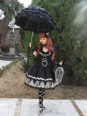Gothic lolita dress mostly in black, but they can dress in white, or jewel toned as well. Crosses, stained glass, angels, coffins, and cemeteries are all motifs quite often used. There are far fewer bows than sweet or classic, and lace is often abstract or features crosses or roses.