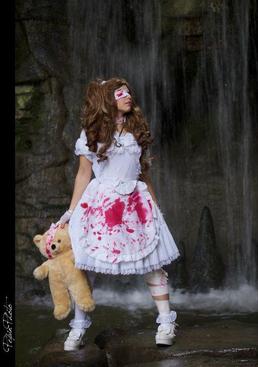 Guro Lolita (grotesque style) is a style in which a Lolita portrays herself as being attacked or wounded, by adding bloodstains on her clothes, ripping them.