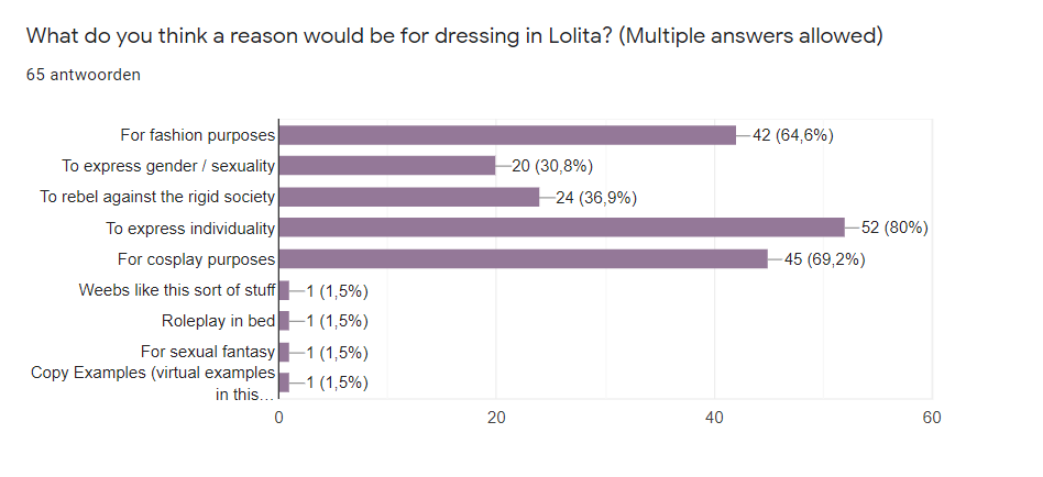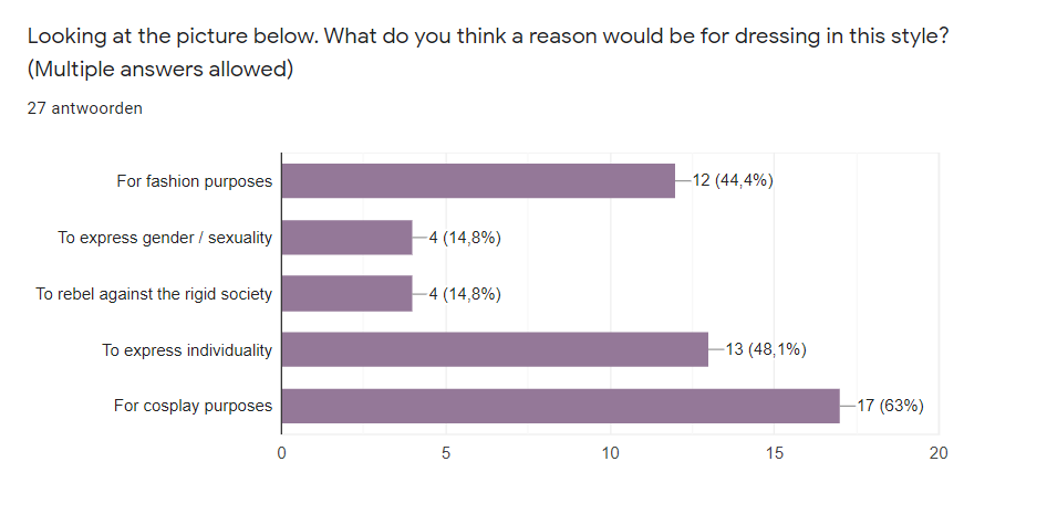 Furthermore, we ventured on the question why people would think Lolita dress the way they do. We can conclude from the responses of the people who know Lolita, that the most chosen answers include 'to express oneself', as well as 'for cosplay purposes' and 'for fashion purposes'. This was interestingly different from our expectations. We expected to receive more answers aiming towards fashion purposes, but this was only the third chosen answer. Other answers included things like 'fulfilling sexual fantasies', which was not within our expectations. For respondents who were unaware of Lolita, by a small margin, 'for cosplay purposes' was the most chosen answer. This was an expected choice, as one could easily mistake Lolita, which has a resemblance to anime clothing, for a costume and thus evoke the idea of cosplay. Without knowledge of Lolita being a fashion subculture, one could assume Lolita dress to match an existing (fictional) character, instead of the true purpose of Lolita, being to realize their ideal identity.