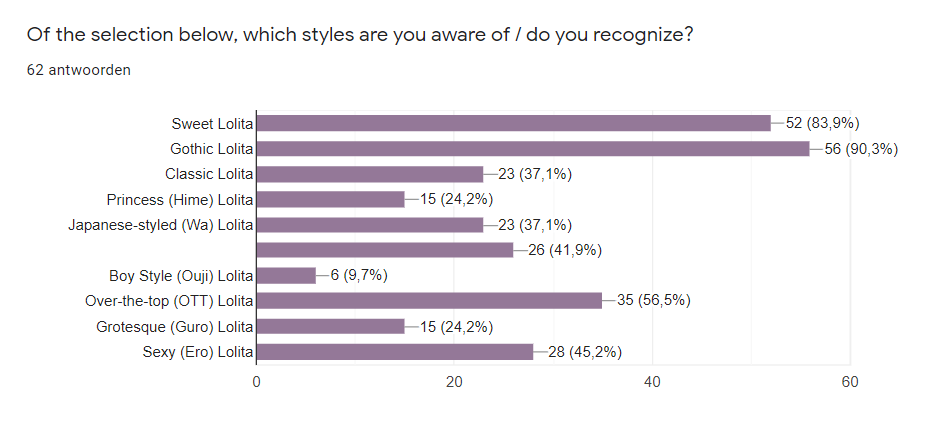 Lastly, we gave our respondents a list of popular Lolita styles and asked them which Lolita style they are familiar with. From this we can conclude that Sweet Lolita and Gothic Lolita were indeed the dominant styles known. As these two styles are also most commonly known in Japan, we thought this might be the case here in Belgium as well. Interestingly, Classic Lolita is also widely considered as one of the main three styles (together with Sweet and Gothic). This was not the reflected in our survey results however.