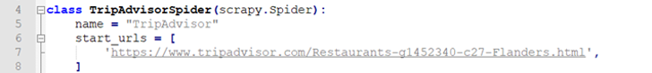 In de eerste lijnen van onze code geven we de scraper een naam (name = "TripAdvisor") en geven we het een URL om mee te beginnen (start_urls = ['https://www.tripadvisor.com/Restaurants-g1452340-c27-Flanders.html',]