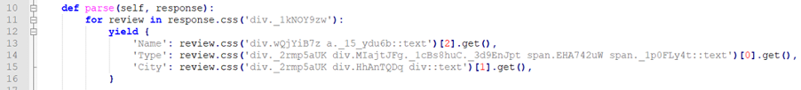 In lijnen 10 tot en met 16 verwijzen we de scraper naar een HTML div met class "_1kNOY9zw". Dit is de class dat de web developers van TripAdvisor aan het vakje van de restaurants heeft gegeven. Zo weet de scraper dat het in elk verschillend soort gelijk vakje moet scrapen, wat dus betekend dat het de restaurants als individuele data ziet, en dus ook als zodanig behandeld. Binnen de "yield" brackets verwijzen we naar de specifieke classes binnen de HTML die we willen scrapen, namelijk de naam (Name), het type (Type), en de stad (City). Omdat de classes regelmatig opnieuw worden gebruikt binnen de HTML van de TripAdvisor pagina moeten we specifiek verwijzen naar de classes die de data weergeven die wij willen scrapen. Hierdoor krijgen we lange lijnen text (b.v. \'div._2rmp5aUK div.MIajtJFg._1cBs8huC._3d9EnJpt span.EHA742uW span._1p0FLy4t::text\') die verwijzen naar de locatie binnen de HTML van onze gewilde data.