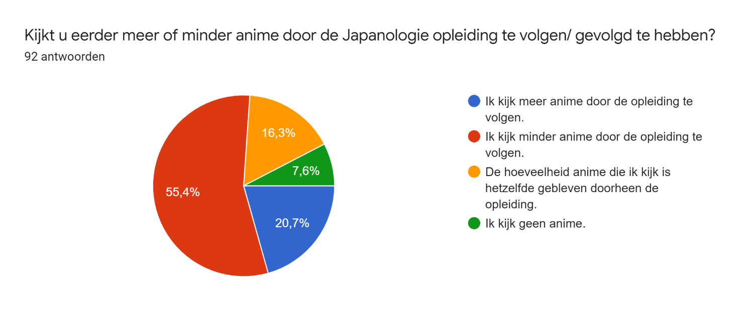 A striking 55% of participants reveal that they watch less anime after starting Japanese Studies. The most common reason is the obligation to study more, thus having less time to watch anime. In comparison, almost 21% watch more anime after starting Japanese Studies, using it as a source of practicing Japanese.