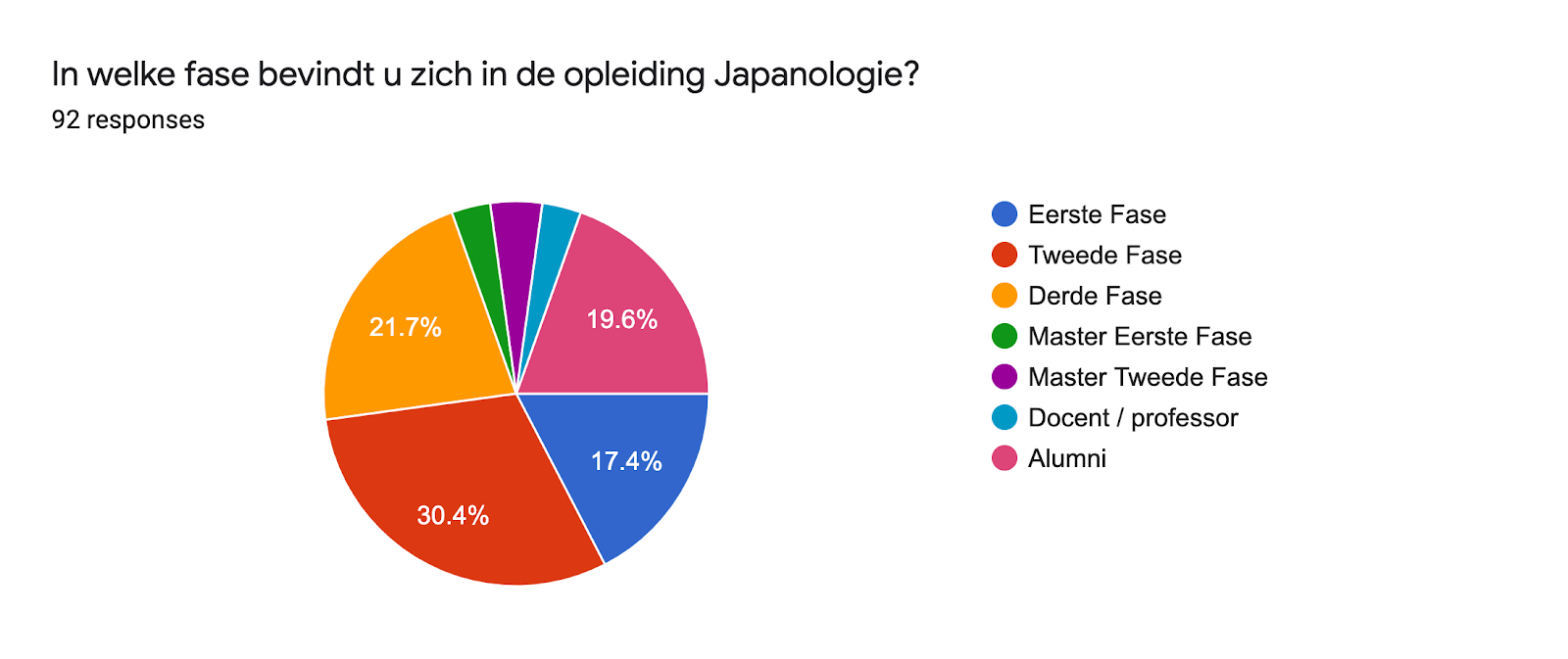 Through Facebook and the Japanology mailing list, we sent out a survey in order to have a wide variety of answers for our research to be representative, by reaching out to not only bachelor students, but also master students, alumni and professors. The pie chart shows that many bachelor students and alumni participated in the research, but the master student and professor representation are quite low in comparison.