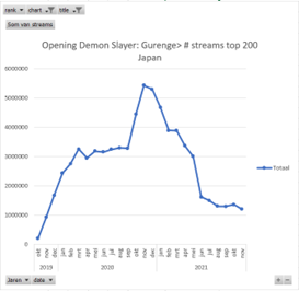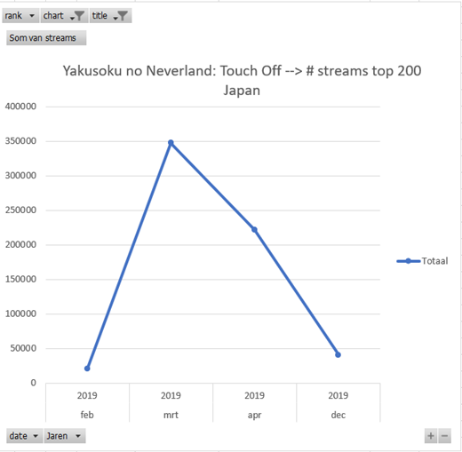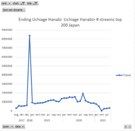 What we can see from the graph above is that the song was popular even before the anime was released yet we can not conclude that it is not partially due to the Anime as there must have been marketing surrounding this Anime. Besides that the popularity of the song increased with large numbers in March when said Anime was released. Although the song tumbles of the top 200 songs in Japan, it does not mean that the song is not popular currently, it just shows how the song has had a big impact on music in Japan as to be on this list it has to be within the top 200 of any song, any genre, in Japan.