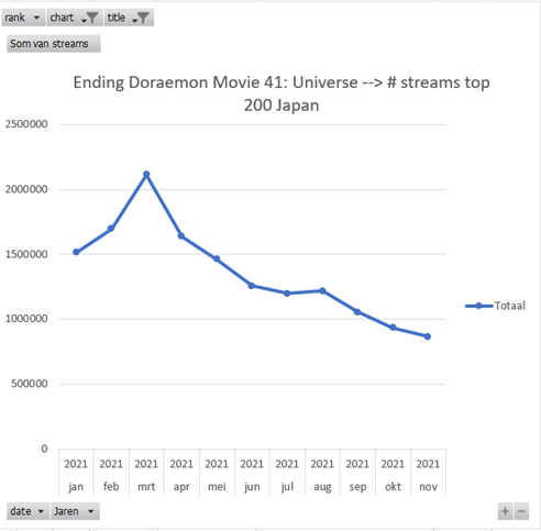 Now, we come to an example that will not show up on myanimelist.net as a popular Anime but it certainly is as Doraemon in Japan is one of the most popular Anime for children. Doraemon the Movie 41: Nobita no Little Star Wars on myanimelist.net is ranked 3981 and popularity is 9901. We can not conclude that this anime is not popular as Doraemon is a staple mark for Japanese culture as a whole. The song "Universe" by "Official HIGE DANdism" is the outro of this movie. We should take into account that the movie does not have an intro song. The popularity of the outro song can be seen in the chart below:
