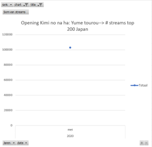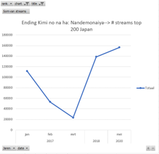 Now we are taking a look at one of the most popular Anime on myanimelist.net with rank 27 and popularity 11 it is certainly one of the most watched Anime. Kimi no na ha is a movie with both an opening and an ending song that are influential such as the Anime. The Anime was released in 2016 which is one year before the timeframe of our research. The Anime got recognition right away with its LAFCA Animation Award in 2016 and the Best Animated Film in 2017 by Mainichi Film Awards. The music, especially the outro song (Nandemonaiya), which is a super popular song, was in the top 200 in 2017 for three months and reappeared in January 2018 again but would not reach its peak until May 2020. This may be due to so many influences but it might be an interesting assumption that this happened due to the influx of Anime viewers due to COVID-19.