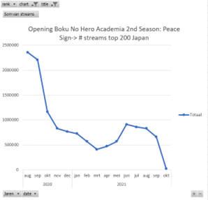 The data for the songs all come from Spotify, which is the biggest streaming platform for music. Within Spotify there are certain playlists, made by Spotify based upon the most popular songs of a certain time period within a certain genre, country,... Whilst scrolling through these charts we found the Top 200 of Japan for a month which included the most popular songs being played in Japan within a month. It included all genres which limited our research as there were many other genres such as (English Pop, Korean Pop,...) yet it added a new dimension to our research. It shows how big Anime actually is, with some Anime opening songs having loads of plays and being in the top 200 playlist of Japan for more than one week.