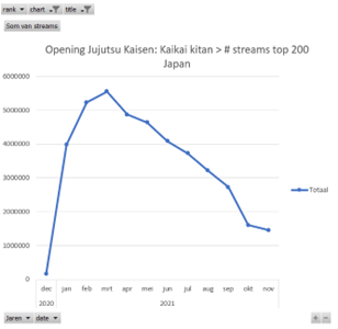 Last but not least we will look at Jujutsu Kaisen with its opening Kaikai Kitan by Eve. Jujutsu Kaisen is the newest Anime that we took to analyze and is rank 66 with popularity 17. Jujutsu Kaisen was released on 3-10-2020 and got a trophy for Anime of the year at the 2022 Tokyo Anime Award Festival (TAAF). This goes to show how popular this Anime actually is.
