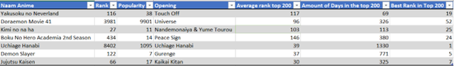 This database was a CSV-file that we imported to Excel and later connected it with the music database to combine the popularity of the Anime and the opening song.