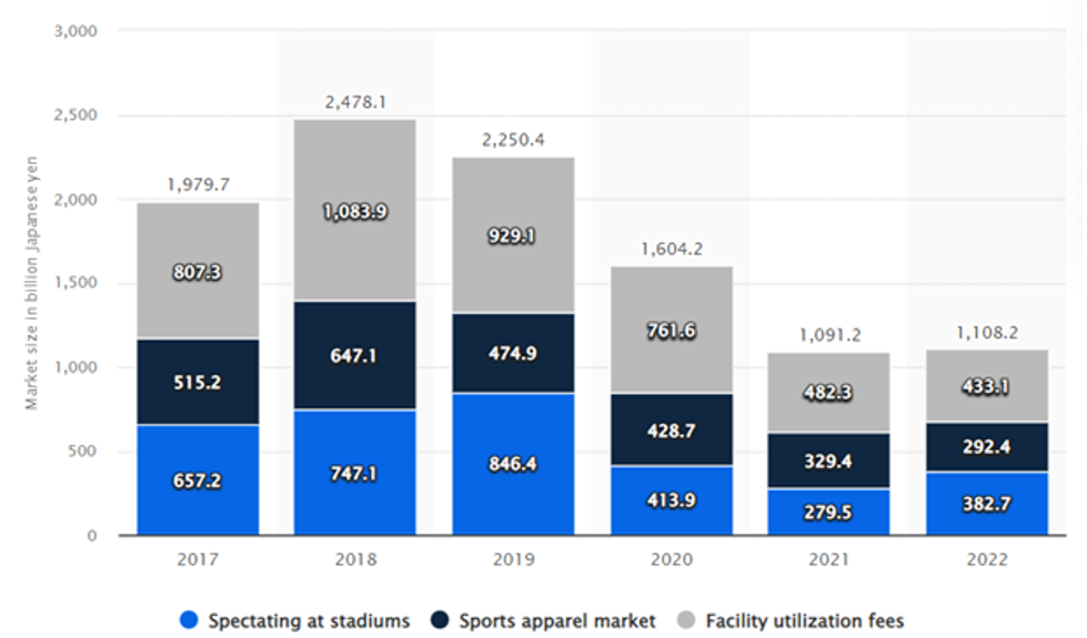 Figure 2: Macromill. (October 27, 2022). Market size of the sports participation industry in Japan from 2017 to 2022, by segment (in billion Japanese yen) [Graph]. In Statista. Retrieved May 23, 2023, from [https://www.statista.com/statistics/1272786/japan-market-size-sports-participation-industry-by-segment/]{.underline}
