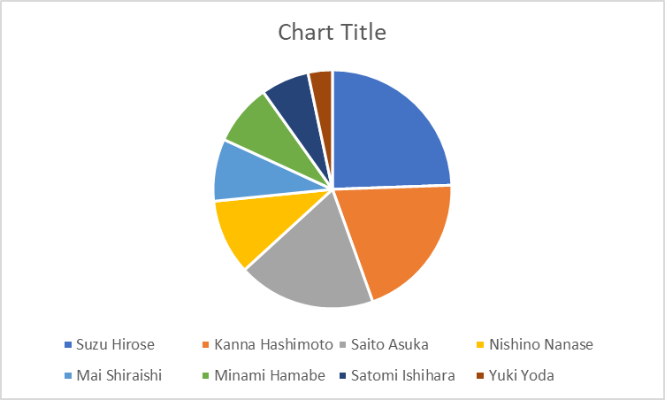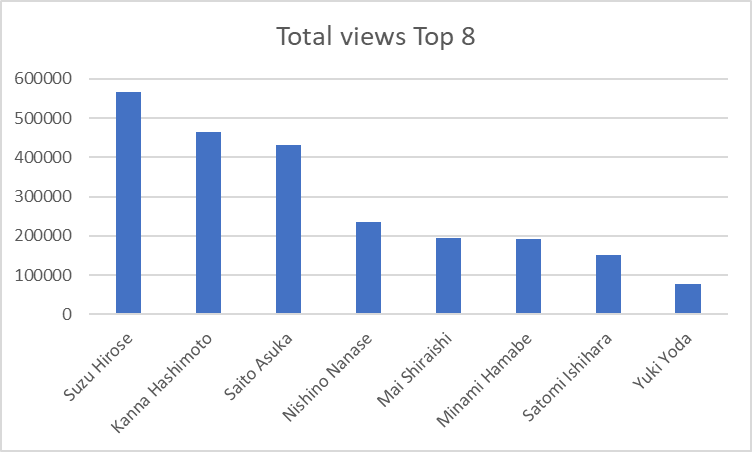 To get an image of the most popular people on the site, we looked at the 5 people with a unique tag that contained the most videos (Asuka Saitō, Nanase Nishino, Kanna Hashimoto, Mai Shiraishi and Yuuki Yoda), and we selected the 3 people who had the highest viewed videos (Minami Hamabe, Satomi Ishihara, Suzu Hirose). We combined these to get a total of 8 people we would then analyse and visualize closer. Here you can see the graph with the total number of views per person.
