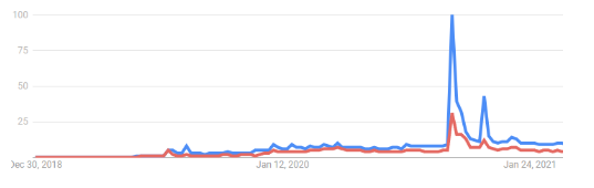 This graph shows the amount of google searches for deepfakes (“ディープフェイク”) in blue and the searches for deepfake pornography (“フェイクポルノ”). There is a clear peak at the beginning of October 2020, when the aforementioned deepfake arrests took place. The similarity between these graphs and the fact that this all coincided with the arrests shows that in Japan, peoples view of deepfakes is heavily associated with deepfake pornography.