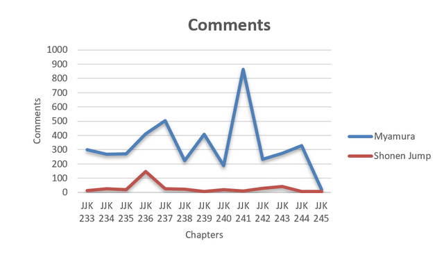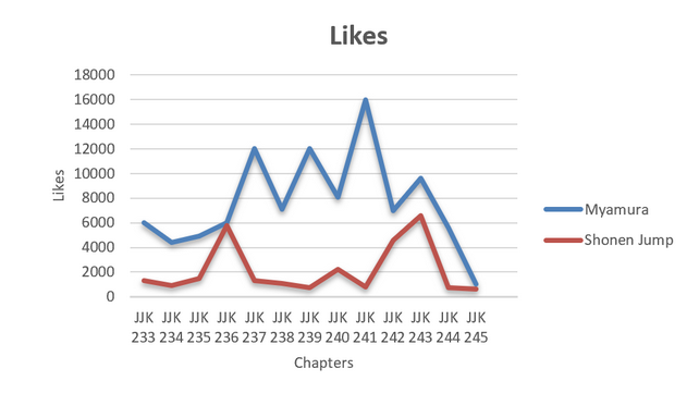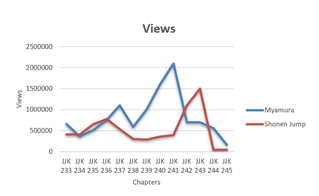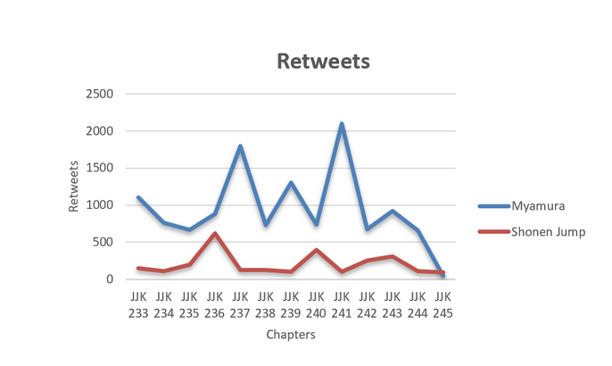 Uit de analyse van de Twitter-interacties tussen Myamura en het officiële Shonen Jump-account, over hoofdstukken 233 tot 245, blijkt duidelijk dat de leaks veel meer betrokkenheid genereren. Op elk vlak likes, views, reacties en retweets zien we dat Myamura aanzienlijk beter scoort. Vooral bij belangrijke wendingen in het verhaal, zoals in hoofdstuk 236 waar het overlijden van Gojo wordt onthuld, piekt de activiteit bij Myamura enorm. Dit toont aan dat fans actief op zoek gaan naar vroege informatie en daar ook emotioneel op reageren. Zelfs tijdens rustiger of meer humoristische chapters blijft het verschil groot, wat erop wijst dat een deel van het publiek de voorkeur geeft aan leaks als hun voornaamste bron. Shonen Jump, de officiële bron, blijft wat achter en kent pas later wat meer succes, bijvoorbeeld bij de onverwachte wending met Yuta in hoofdstuk 243.Samengevat tonen de cijfers aan dat leaks een stevige invloed hebben op hoe en wanneer fans betrokken raken bij de reeks. Ze verschuiven de fan reacties en discussies naar onofficiële kanalen, nog voor de officiële release er is. Dit vormt een reële uitdaging voor uitgevers, die daardoor grip verliezen op het moment en het platform van engagement.