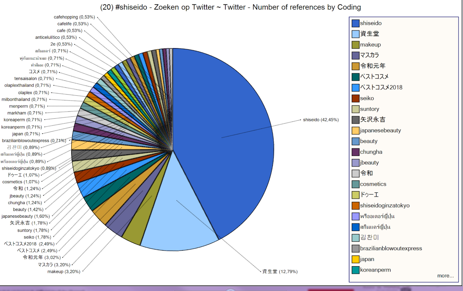 This Pie Chart shows all the words associated with the hashtag 'Shiseido', a famous Japanese makeup and skincare brand.