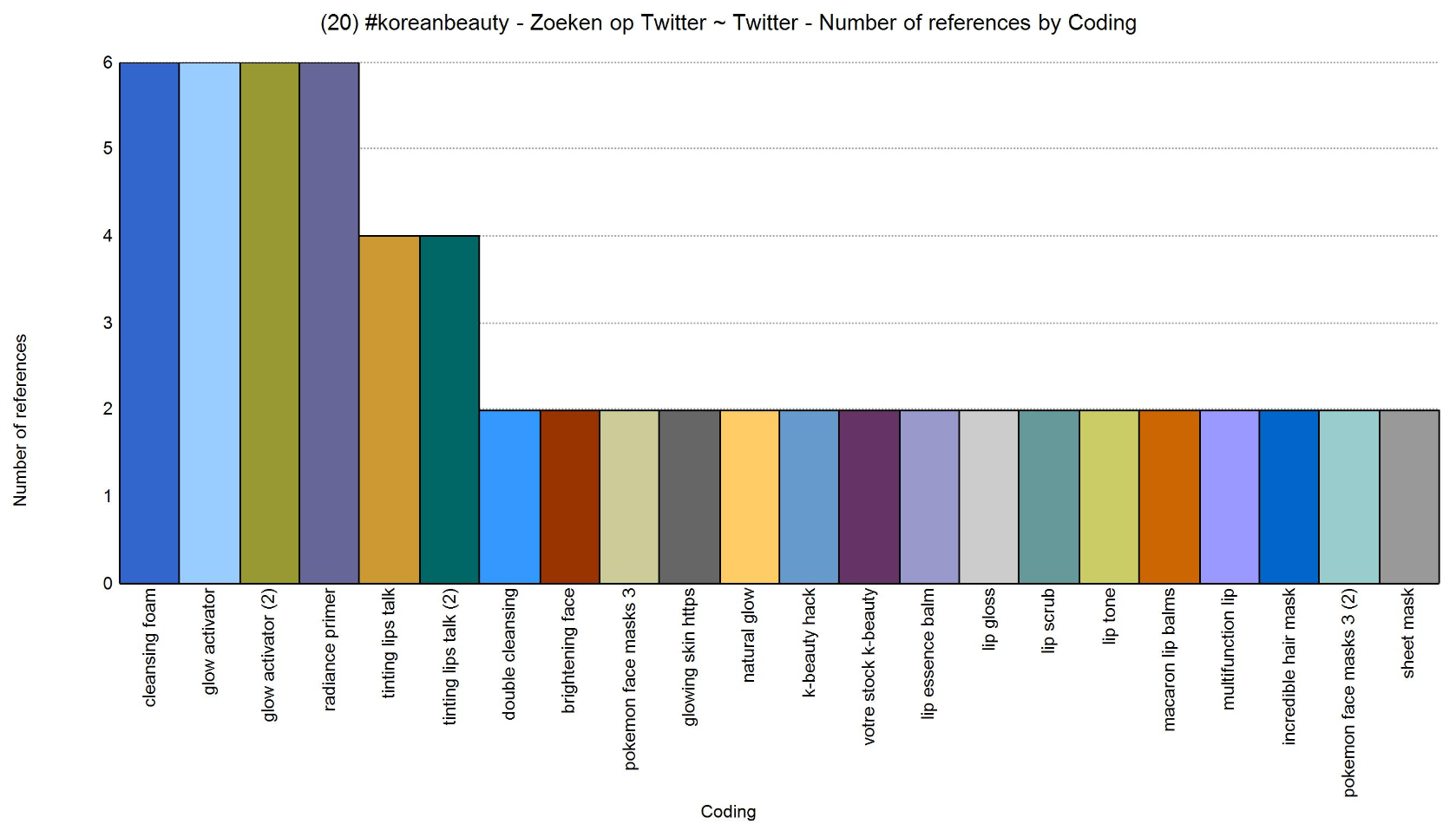 The graph above views a collection of words that are associated with the hashtag 'Koreanbeauty', we wanted to compare the popularity of the hashtags between Japan, Korea and America, but unfortunately although the amount of hashtags surrounding Korean makeup were a lot, the amount of hashtags of Japanese makeup or American makeup were almost non existent. There were a couple of reasons for that. First, using a hashtag with 'Japanese' and another word associating with beauty led us to a different categorie than we were aiming for. Second, the term 'American' with the term 'makeup' is usually not used together in a hashtag, people just use the term 'makeup', but this term does not only include American makeup.