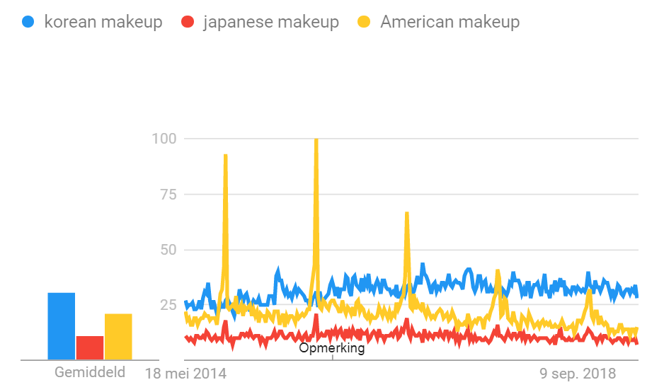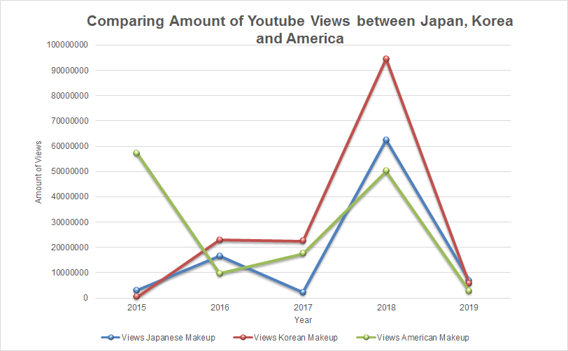 This is data we webscraped from youtube and imported in excel. We webscraped the term 'Korean makeup', 'Japanese makeup', and 'American makeup'. After webscraping the pages on youtube we combined the data of the amount of views between 2015 and 2019 of the three different search terms and put it in the graph you see below.