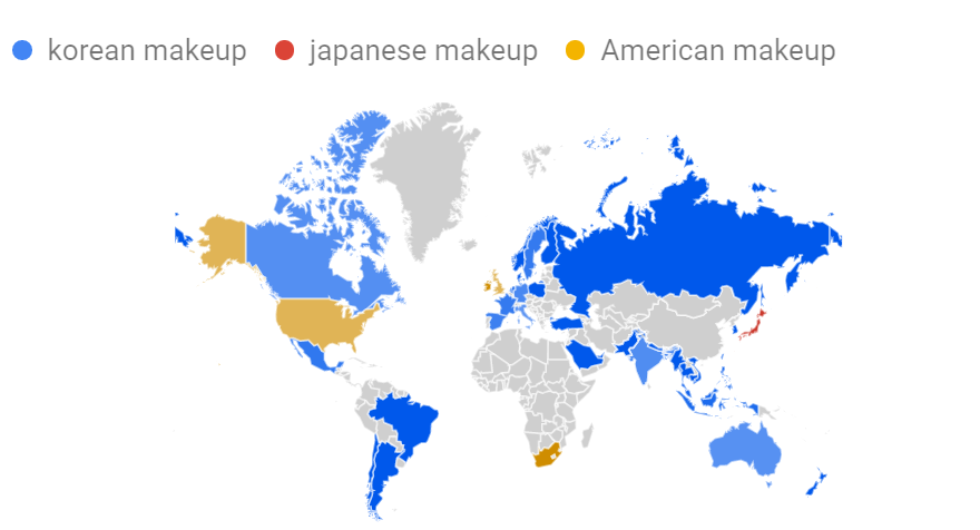 As seen in the google trend graph and the webscraping data, we can conclude that in comparison to Japan and the US, Korean makeup has risen in popularity in the last 5 years. This led to Korean trends also becoming popular in other countries, as shown in the world map data we collected on Google trends. This is in contrast to Japan, where the most searches were done in Japan itself.